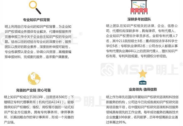 1、專業(yè)知識(shí)產(chǎn)權(quán)背景——明上利用自己專業(yè)化的知識(shí)產(chǎn)權(quán)背景,為企業(yè)知識(shí)產(chǎn)權(quán)領(lǐng)域業(yè)務(wù)提供專業(yè)解決、代理申報(bào)服務(wù)并完善雙軟認(rèn)證中關(guān)于企業(yè)自主知識(shí)產(chǎn)權(quán)的專業(yè)問題。