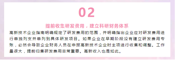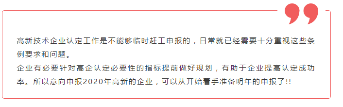 所以提醒大家:首先,要及時申報高新技術,難度肯定是會逐年提高的。如果今年可以申報,千萬不要等到明年;第二,確保申報成功率,必須提前做好高新技術企業(yè)認定規(guī)劃。例如,今年申報為時已晚,那么2020年的高科技企業(yè)認證將從現(xiàn)在開始準備。準備越多,成功率越高。